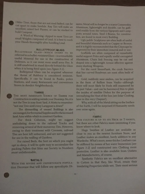 Below you will find a surprisingly well-kept copy of A Steampunk's Guide to the Apocalypse, created by Margaret Killjoy in 2007. These pages were located in some blasted-out hotel ruins in Piscataway, New Jersey. They were buried beneath the torn and twisted shards of an excessive amount of gears and goggles. The purpose of such a profusion of gears and goggles has yet to be determined however the usefulness of the excavated pages cannot be overstated.